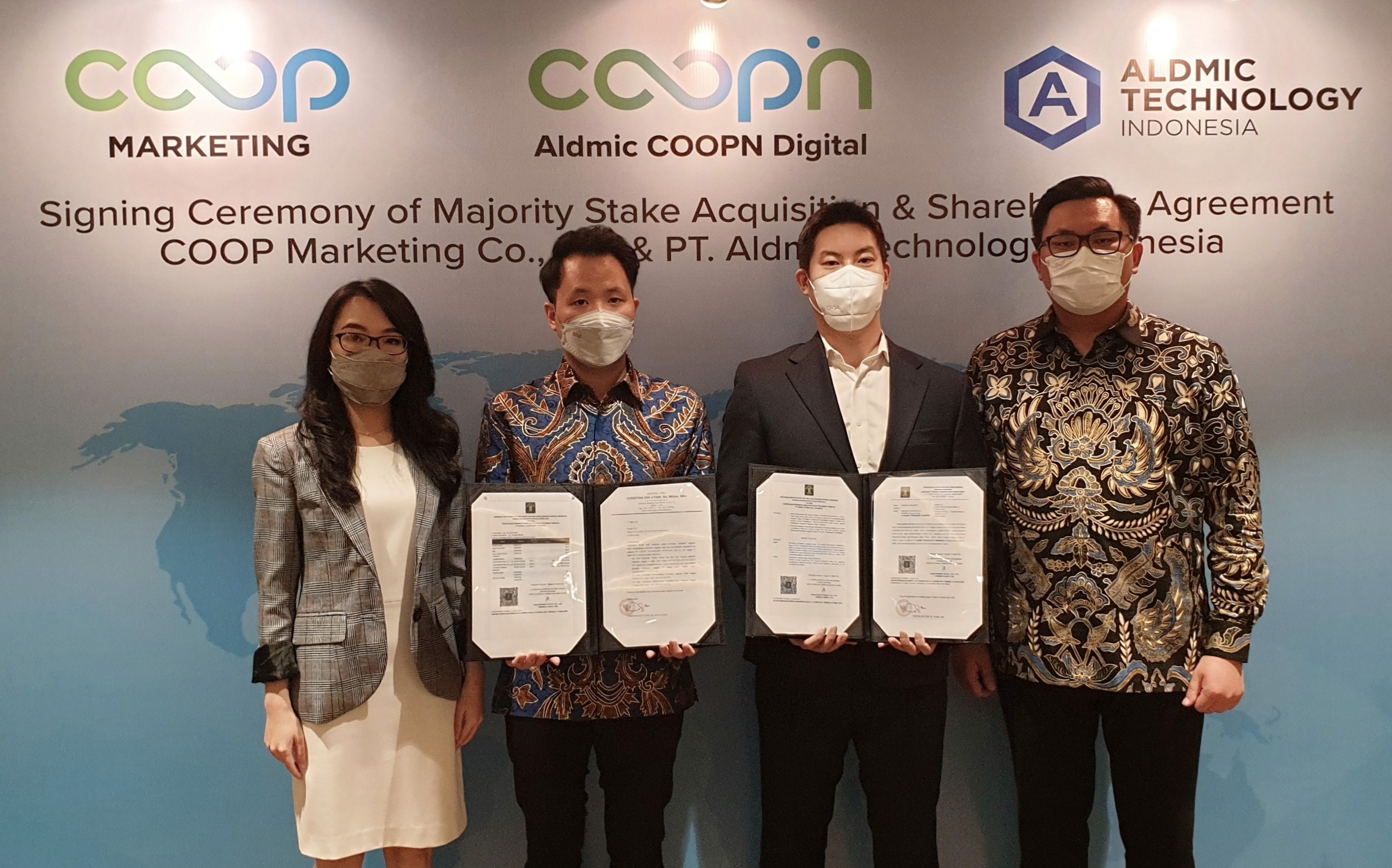 [사진설명: 모바일 플랫폼 기업 쿠프마케팅(대표 전우정)이 인도네시아 모바일 쿠폰 전문기업인 알드믹 테크놀로지 인도네시아(Aldmic Technology Indonesia)의 경영권을 인수했다고 22일 밝혔다. (왼쪽에서 세번째) 쿠프마케팅 홍승기 최고전략책임자(CSO)와 (왼쪽에서 두번째) 알드믹 테크놀로지 윌리 윈토바니 토마스(Willy Winthovany Thomas) 대표가 21일 인도네시아 자카르타에서 열린 사이닝 세리머니에서 관계자들과 기념 촬영을 하고 있다.]