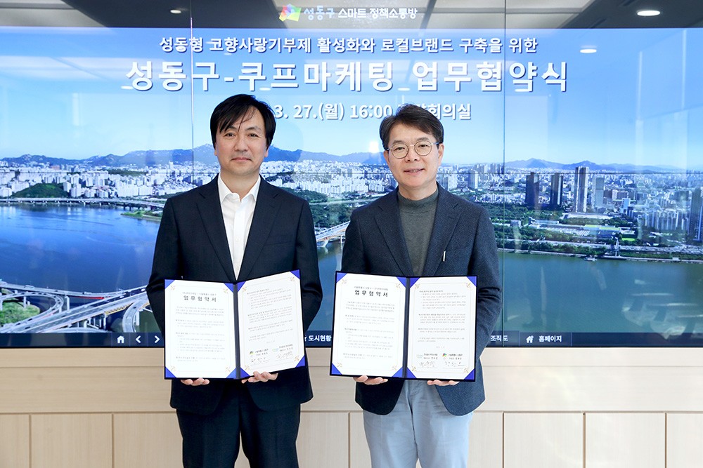 업무협약식은 지난 27일 성동구청에서 전우정 쿠프마케팅 대표, 정원오 성동구청장과 관계자들이 참석한 가운데 진행됐다. 양 기관은 협약을 통해 성동구 고향사랑기부제 답례품으로 ‘성수 핫플패스’를 선정하고 성동형 고향사랑기부제 활성화에 적극 협력하기로 했다. 또한 향후 성수동을 비롯한 성동구의 로컬 브랜드 구축을 위해 상호 협력하는 데 뜻을 모았다.