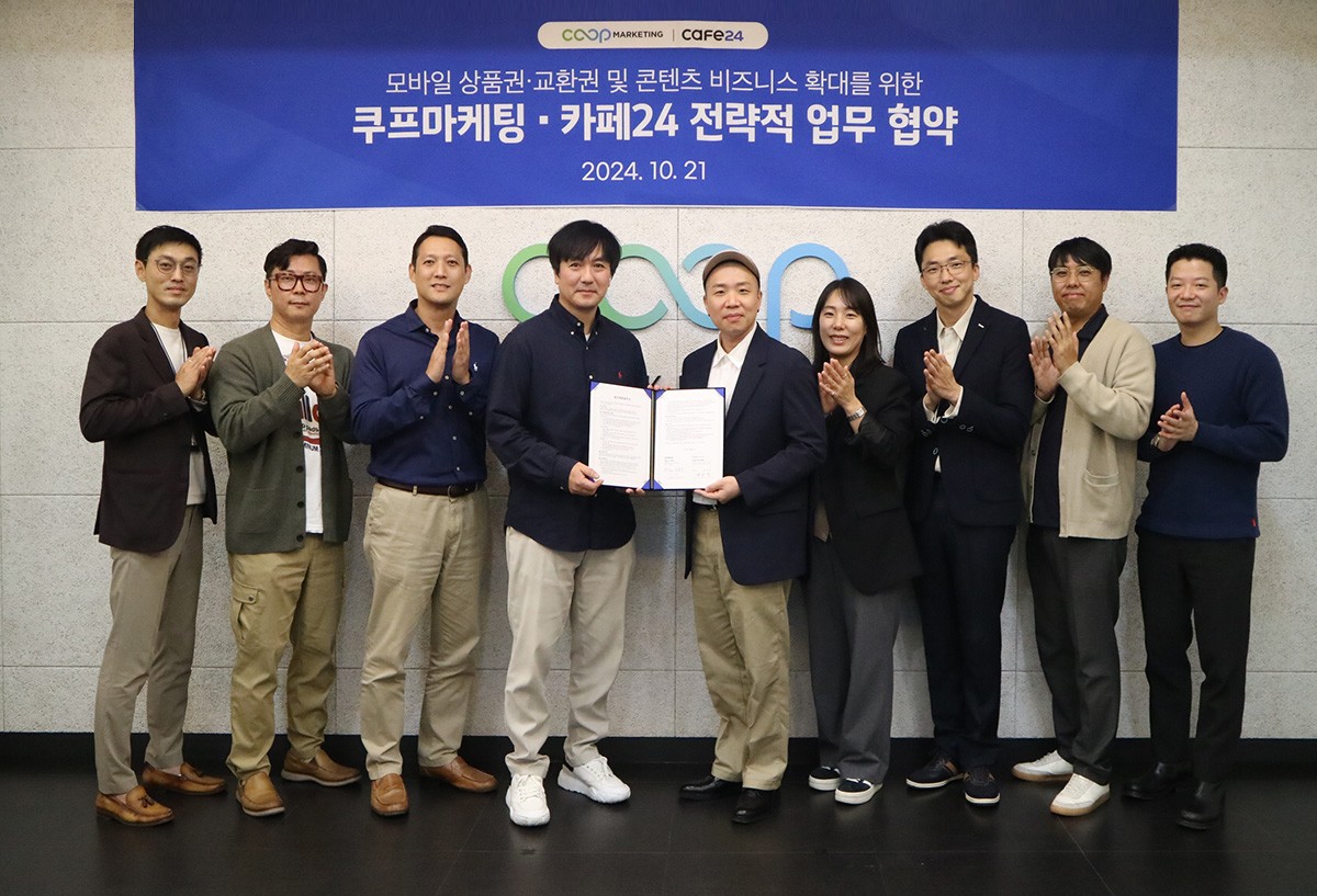 [2024.10.22] 모바일 플랫폼 기업 쿠프마케팅(대표 전우정)은 글로벌 전자상거래 플랫폼 카페24(대표 이재석)와 업무협약(MOU)을 체결하고 모바일 상품권·교환권 및 콘텐츠 비즈니스 확대를 위한 협업에 나선다고 22일 밝혔다.